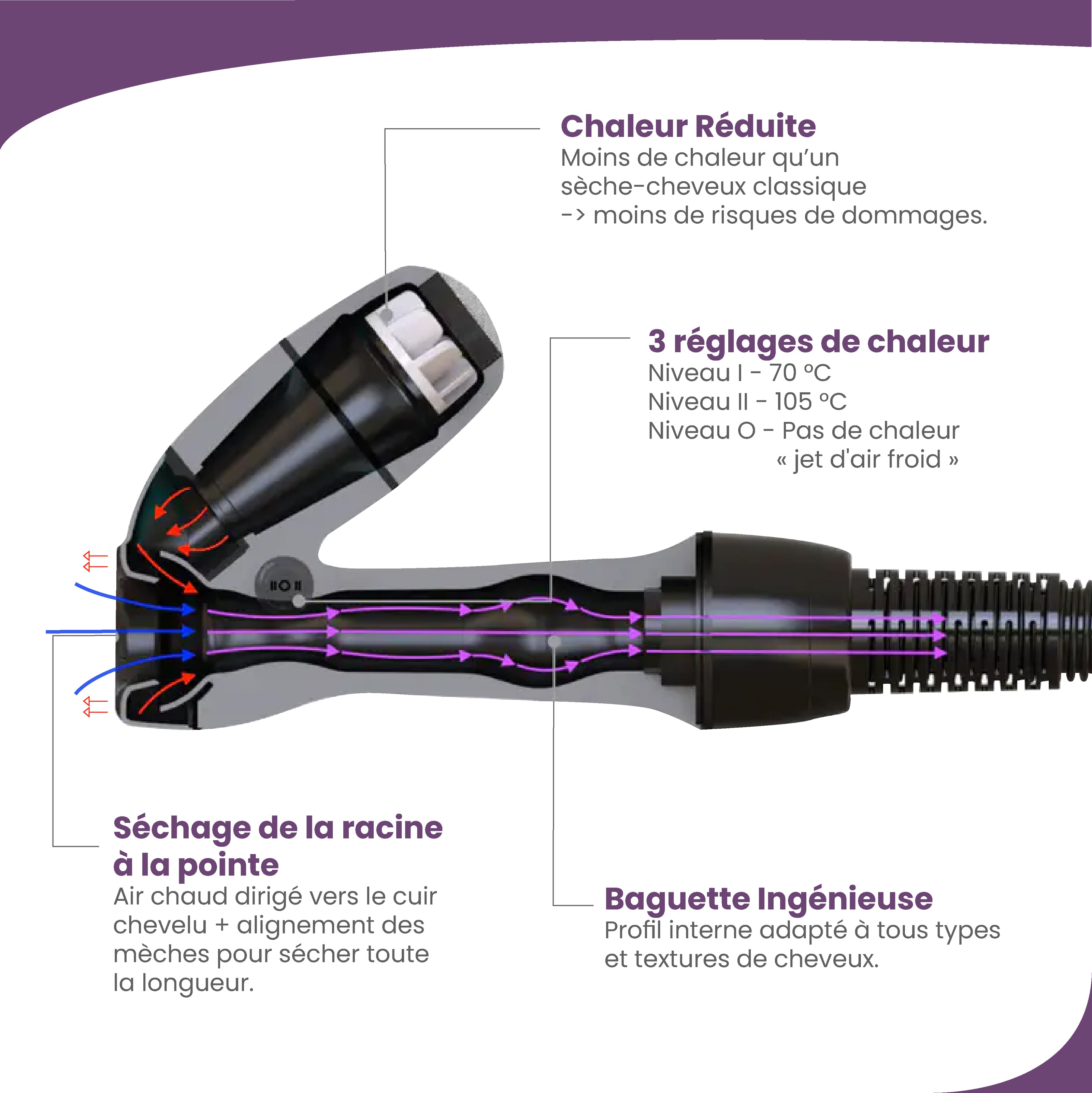 Le flux d'air à pression négative referme et scelle les cuticules de la racine à la pointe et aligne les mèches, laissant vos cheveux scellés, protégés et brillants.