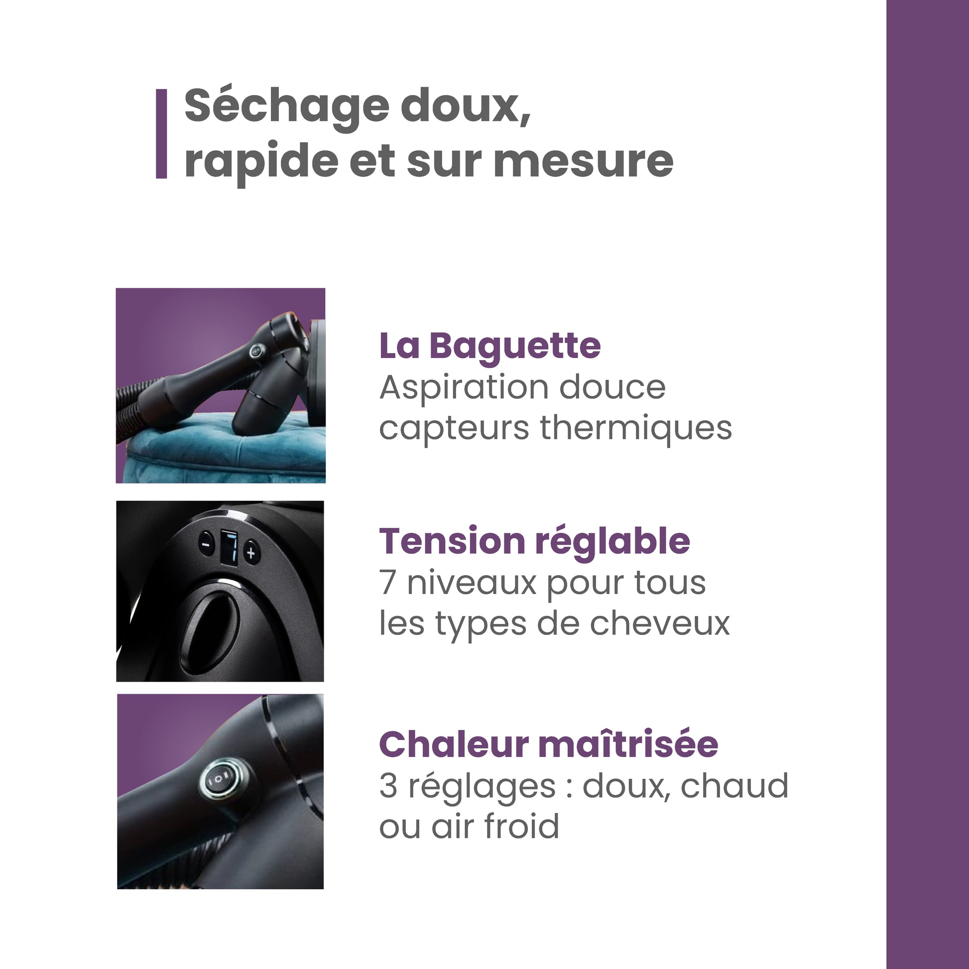 En moyenne, Sovana réduit le temps de séchage de 70 % par rapport à un sèche-cheveux classique, selon votre type et longueur de cheveux.